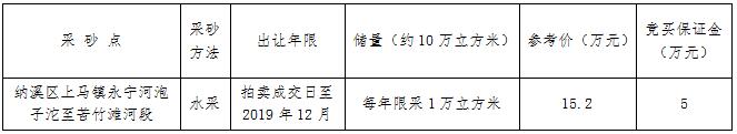 我公司受委托,于2017年4月6日上午10時(shí)在納溪區(qū)公共資源交易中心面向社會(huì)公開(kāi)拍賣瀘州市納溪區(qū)上馬鎮(zhèn)永寧河泡子沱至苦竹灘河段采砂點(diǎn)的采砂權(quán)。具體事項(xiàng)公告如下:
